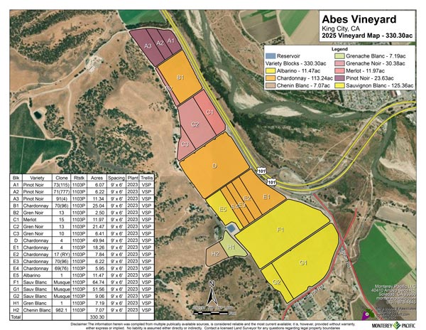Managed by Monterey Pacific with a focus on site uniformity and fruit quality, Abe’s Vineyard is planted using VSP spur-pruned systems with rows running in a northwest-to-southeast orientation to optimize sun exposure, airflow, and vine balance. Together, these elements create a vineyard that blends precision farming with a strong sense of place and offers wineries a dependable source of high-quality fruit rooted in both performance and character.